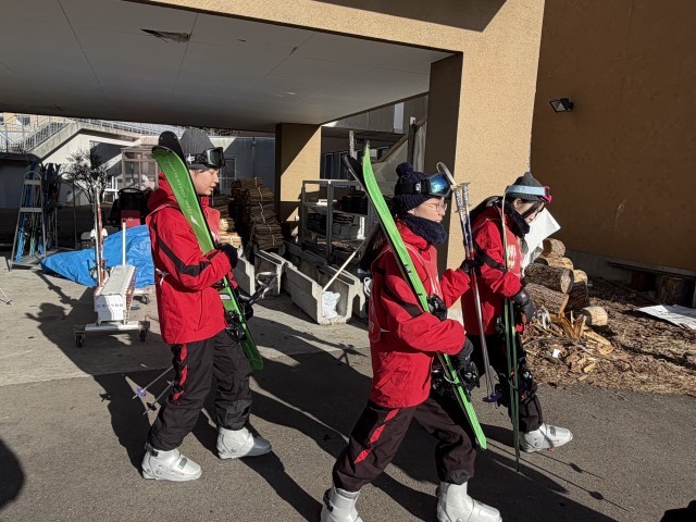 2年生のスキー教室準備です。宿舎でブーツを履いてスキー板を持ってすぐゲレンデです。