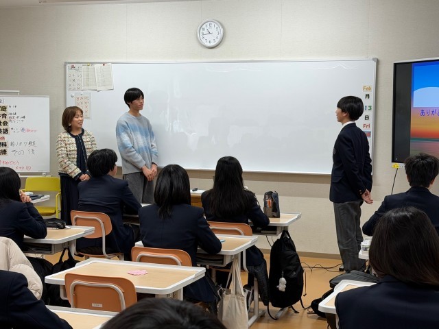 本日は、医学生によるがん教育授業として、名古屋大学医学部の柳沢祥太様、元アナウンサーでがんサバイバーの河野美和様をはじめ、関係協力団体の皆様にご来校いただき、2年生の授業を行っていただきました。お二人とも大変わかりやすい説明と資料でがん予防の知識を正しく身に付けることができ、2年生からもたくさんの質問が出ました。お二人からは、2年生が真剣に話を聞いてくれてうれしかったですというお褒めの言葉をいただきました。