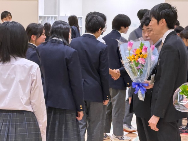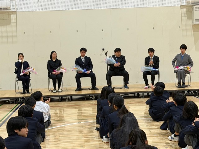 本日は離任式を行いました。転出される教職員からお一人ずつあいさつをしていただきました。また、体育館を出る際には、多くの生徒がお礼のあいさつをしたり、握手をしたりと名残惜しい時間となりました。お世話になりました保護者・地域の皆様、卒業生の皆さんに、離任する教職員を代表及び代弁して御礼申し上げます。ありがとうございました。