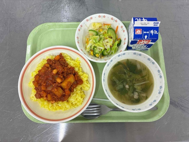 チリビーンズライス、コールスローサラダ、ジュリエンヌスープ、牛乳