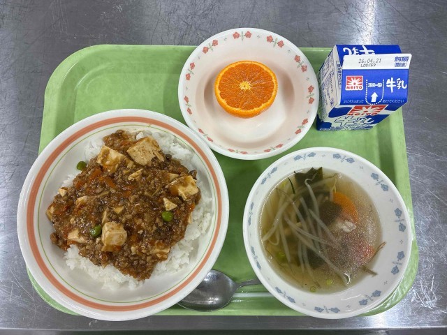 麻婆豆腐丼、中華わかめスープ、カラマンダリン、牛乳