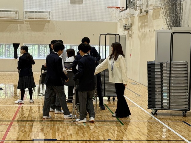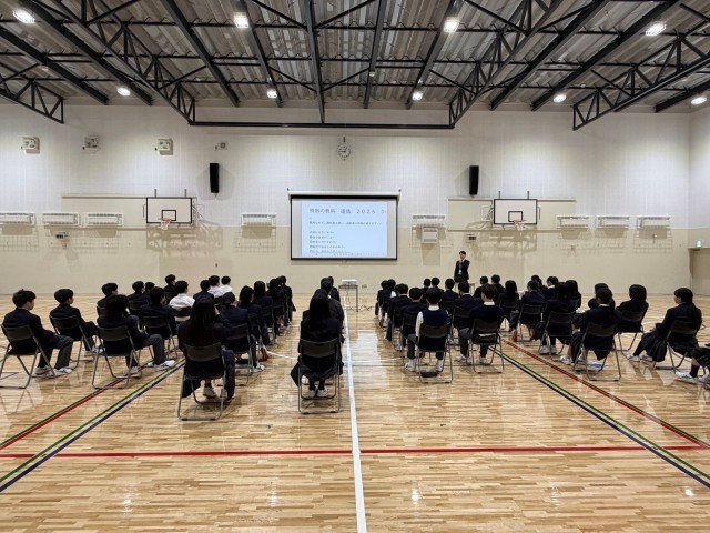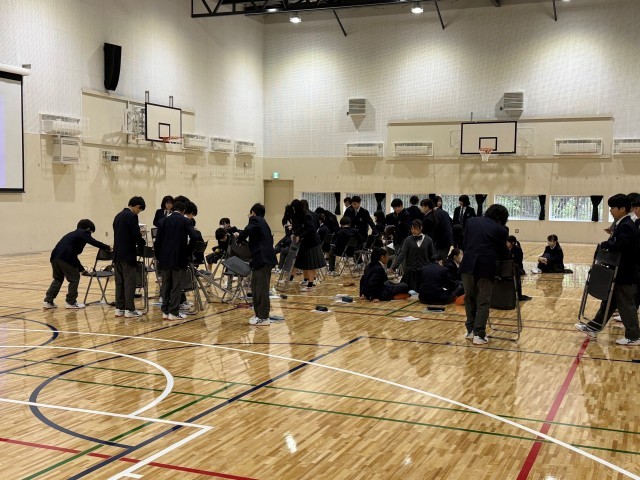 本日の1時間目に1年生が中体育館に集まり、1組と2組の合同道徳を行っていました。まずはイス並べからスタートです。学年の先生の指示でテキパキとイスを並べ、指示がなくとも前後左右を整えて写真1枚目のような隊形を作っていました。大変素晴らしいです。1年生の良いところを授業前から発見できた道徳でした。