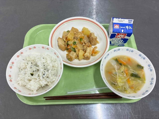 わかめご飯、厚揚げとじゃがいものそぼろ煮、キャベツとえのきのみそ汁、牛乳