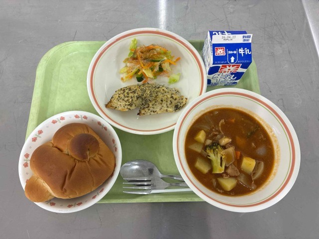 久しぶりのパンで子どもたちは喜んでいました♪ハンガリアンシチューはコクがありながらもあっさりとしたシチューパンにもあいます。魚の香草焼きに使用しているマヨネーズはエッグケアマヨネーズです。アレルギーの子でも食べられるように献立を工夫してみました。