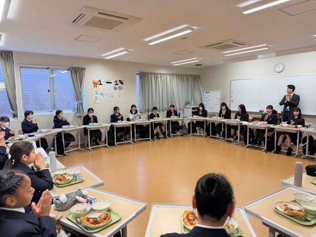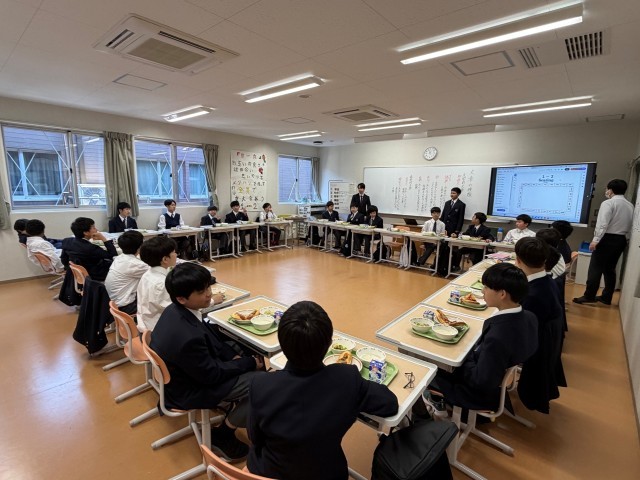 本日は1年生が初めてのランランランチです。これは保健給食委員会考案の企画として、より給食の時間を楽しく、いろいろな人や学年の人と交流をしよう目的があります。様々なグループや交流方法を保健給食委員会の生徒が主体的に発案してくれています。本日の1年生のテーマは、男子同士、女子同士で給食を食べながら交流して仲良くなろうです。輪になって楽しそうです。