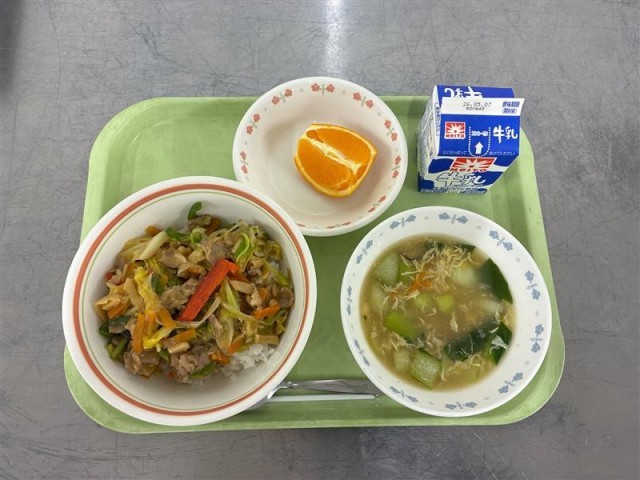 回鍋肉丼、チンゲン菜とトックのスープ、清見オレンジ、牛乳