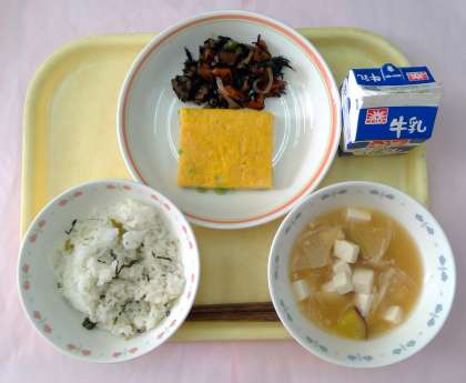 高菜ご飯 枝豆入り卵焼き ひじきの五目煮 鶏ひき肉の呉汁 牛乳