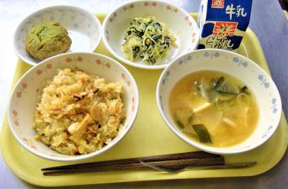 鶏五目ごはん 野菜ののりじゃこ和え 厚揚げの味噌汁 おから入り新茶ドーナツ