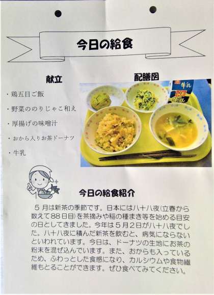 新茶のでる5月に合わせてお茶をつかった献立です。日本には、八十八夜という茶摘みや稲の種まきを始める日があります。