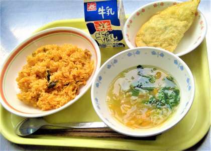 キムチチャーハンは、キムチの汁も使って炊き込みました。見た目ほどからくもなく、給食では定番の人気献立です。