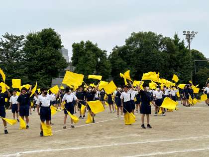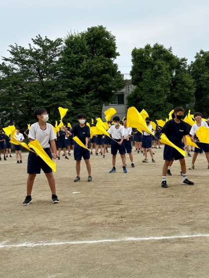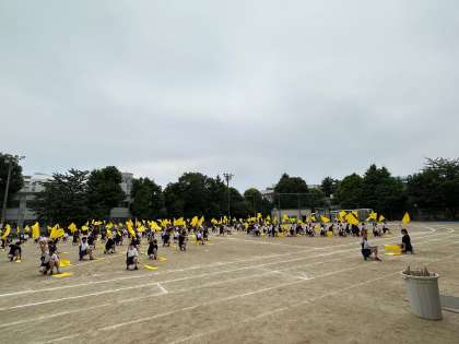 ようやく校庭でマスゲーム練習ができました。3年生リーダーのもと、1年生もがんばっています。天気は下り坂ですが、予報では明日の予行練習は実施できそうです。