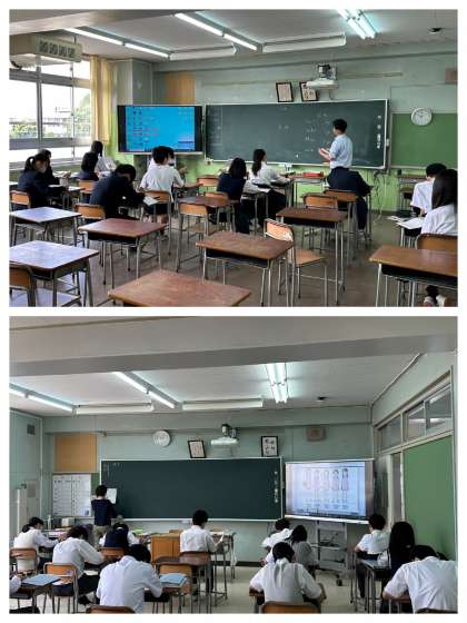 大きな行事が終わり、各学年とも授業に励んでいます。写真は上から3年1組社会、3年2組理科、2年1組体育、2年2組英語、1年1組数学の様子です。なお、定期考査2週間前です。慌ただしく時間が過ぎていきます。