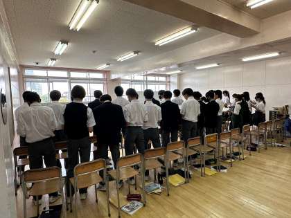大変良い天気です。気温も上昇していますので、生徒の皆さんは水分補給をしっかり行ってください。1時間目の授業、上から3年1組音楽、2年2組体育、1年1組数学の様子です。広尾中の良さに「歌声」が挙げられますが、それを支えているのは3年生だとわかる歌声が響いています。