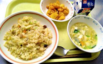 ビーンズポテトは、その名のとおり、豆とじゃがいもを揚げて作っています。スナック感がありますが、ほかの学校でも人気がある献立です。