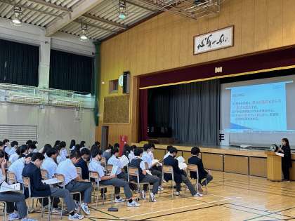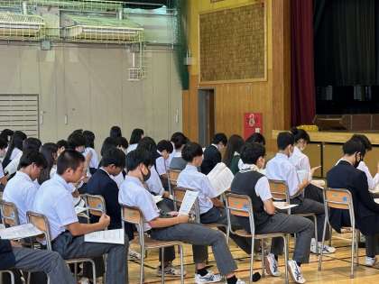 まだまだ汗ばむ気温ですが10月に入りました。前期も残りわずかです。本日は3年生が2回目となる進路説明会を行いました。進路について不安ながらも前向きに取り組んでいる3年生、みんなが希望の進路に進めるように祈っています。なお、本日の保護者会後に同じ内容で保護者向け進路説明会を開催します。