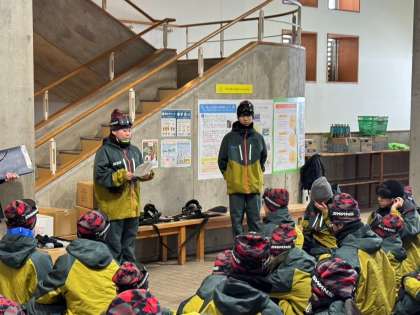2年生移動教室、インストラクターさんとの顔合わせも終わり、いよいよスキーブーツの説明を受けています。