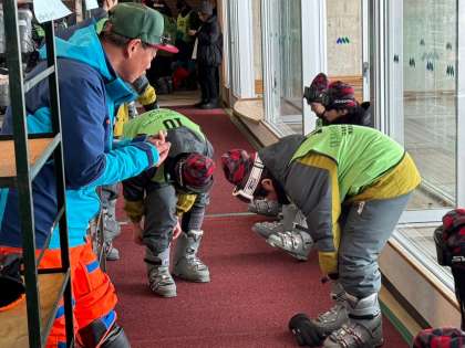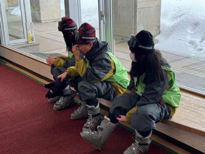 いよいよスキー教室開始です。まずはブーツ合わせ。インストラクターさんにしっかり教わっています。
