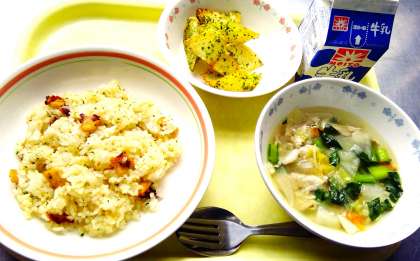 ペペロンチーノピラフ 青のりポテト 冬野菜のスープ