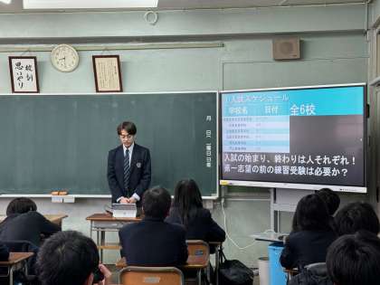 本日から、3年生が1・2年生の教室に行き、受験を終えた体験談や準備すべき点についてプレゼンをしてくれています。3年生の説明はさすがの一言ですが、1・2年生の聞く態度も良く、特に来年度受験を控えた2年生は、真剣に説明を聞いている様子でした。