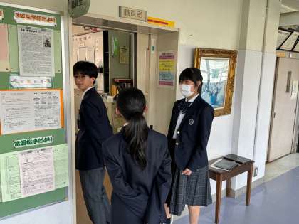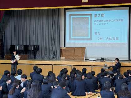 1年生が3年生にアテンドされ、校内巡りを行いました。1年生1名に対して、3年生3名が付く手厚いサポートです。校内巡りを終えた後は、3年生主催の広尾中クイズで盛り上がり、司会も日本語と英語で行いました。3年生の皆さん、ありがとうございました。