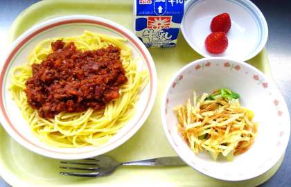 ミートソーススパゲッティー ハニーポテトサラダ いちご