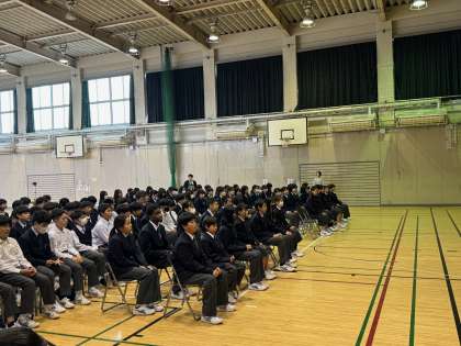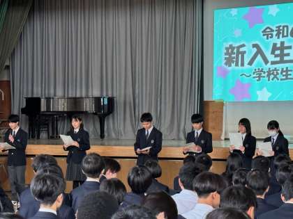 本日は新入生歓迎会を行いました。前半は、生徒会から学校生活について、各専門委員会委員長から仕事内容の説明を聞きました。