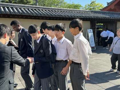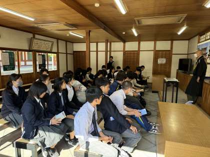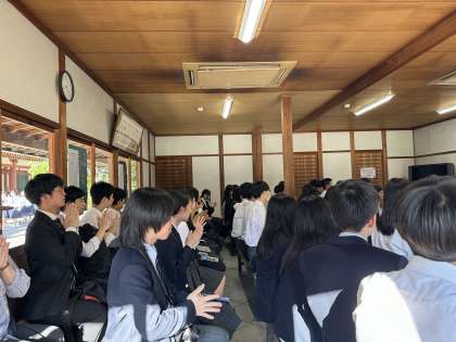 薬師寺見学ではまず説法を聞きました。面白く話していただき、リアクションも良好です。