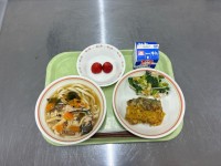 沖縄の方言で「ジューシー」は炊き込みご飯 、「サータ」は砂糖、「アンダギー」は揚げ物の意味を持ちます。サーターアンダギーとドーナツの違いは水分で、ドーナツは牛乳などの水分を多めにいれてますが、サーターアンダギーは卵を多めにつかって作ります。揚げると生地が割れて、チューリップのようになります。全クラス全ての献立完食でした💮