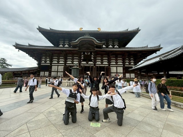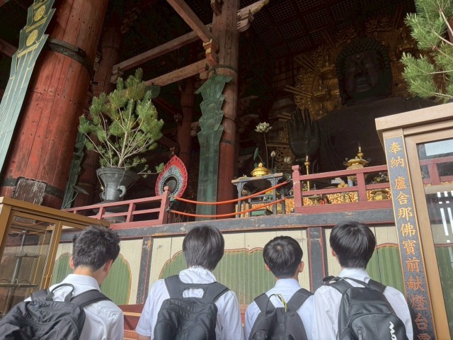 奈良の大仏の大きさには圧倒されていました。大仏殿見学後は春日大社や興福寺などを班行動で見学し、電車で京都に向かいました。