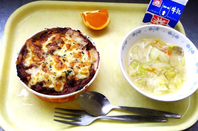 今日のドリアは4層仕様になっています。一段目:ターメリックライス、二段目:ドライカレー、三段目:ベシャメルソース、四段目:チーズ&パセリ で焼き上げました。ひとつひとつ調理員さんが丁寧に作ってくれました。今日も完食です💮