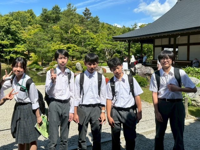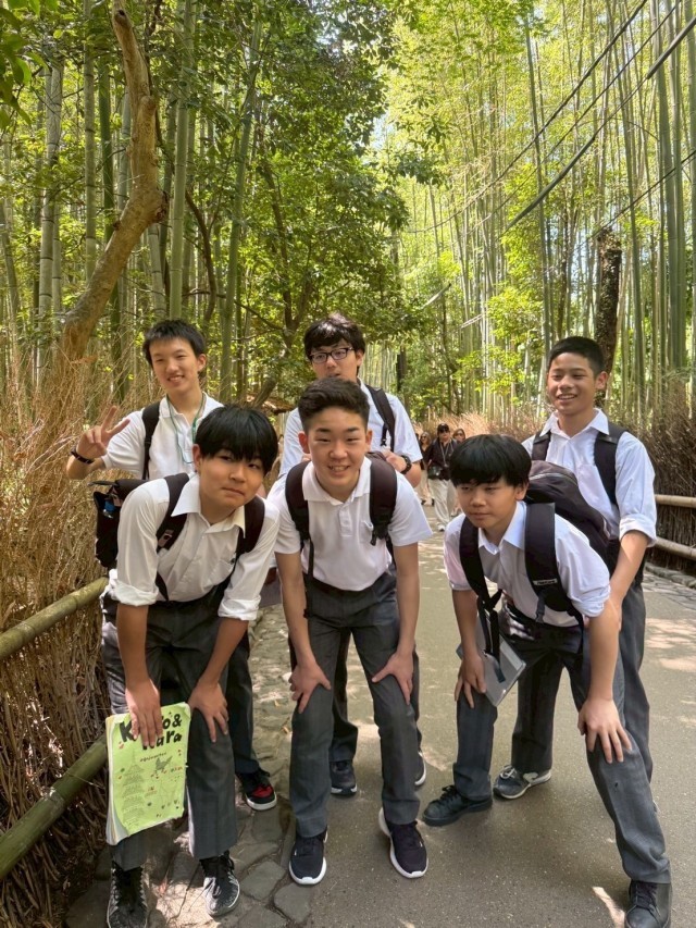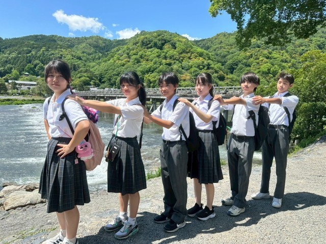 班行動の様子、嵐山の渡月橋、天龍寺、竹林等を回りました。