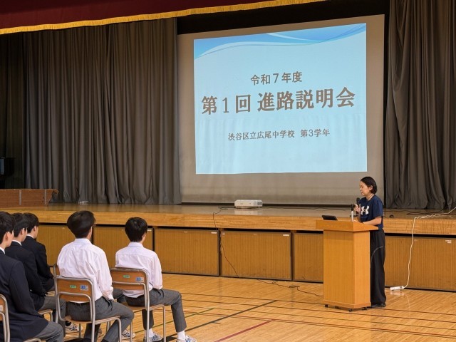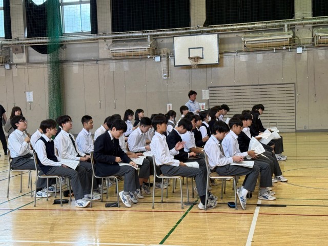 本日の1時間目に3年生が進路について説明を聞きました。進路指導担当の先生からの説明を真剣に聞いている様子でした。定期考査も迫っていますので、進路選択を視野に入れた学習、学校生活を送るようにがんばってください。保護者の皆様におかれましては、あいにくの雨天となってしまいましたが、午後の進路説明会へのご来校お待ちしております。1・2年生の保護者の皆様もぜひどうぞ。