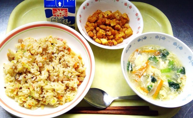 炒飯は大量調理では混ぜご飯のように作ることが多いですが、家庭をつくるように具を炒めたところにご飯を加え、あおり炒めをしています。給食の回転釜という大きな釜に、大きなスコップのようなヘラをつかって100人弱の量を何回も一気に火を加えながら炒めています。体力のいる作業ですが、パラパラの炒飯が提供できました。