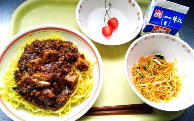麻婆豆腐を焼きそばの上にかけて食べます。麻婆豆腐といえば中国を代表する料理のひとつです。広東では香辛料は控え、コクとうま味に重点をおき、四川は辛さとシビレをきいているが特徴といわれています。さくらんぼは時期が限られる果物です。今日は全クラス、すべての食缶が空っぽでした💮
