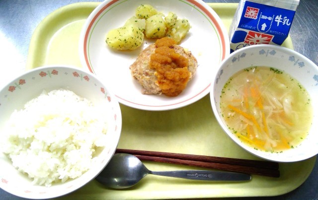 ごはん チーズ混ぜ込みハンバーグ 粉ふき芋 ジュリエンヌスープ