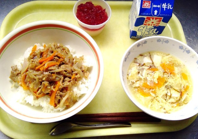 中間試験お疲れ様でした。疲れもたまっていると思うので、疲労回復献立です。豚肉と生姜、もずくは身体を元気にする栄養が多く含まれているので、週末も元気に過ごしてください。あじさいゼリーは6月に咲くあじさいに見立てたゼリーです。ブドウゼリーを作り、クラッシュしたものをカルピスゼリーの上にのせました。