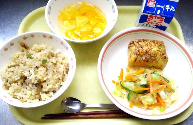 しぐれ煮の由来は諸説ありますが、しょうゆや砂糖などで甘辛く煮たもものを指すことが多くなりました。袋焼きは中身を作り、ひとつひとつ給食で具材をつめてさらに焼き上げました。フルーツポンチにはサイダーをクラスでいれてもらい、シュワシュワを楽しんでもらいました。