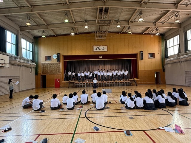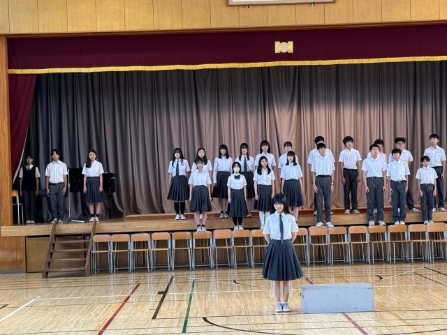 2年生と3年生が合同で若木祭に向けて、合唱コンクールのリハーサルを行いました。ステージへの出入りのやり方は3年生が見事な手本を見せ、2年生もしっかり続いていました。歌もお互いに刺激し合ってがんばってほしいと思います。