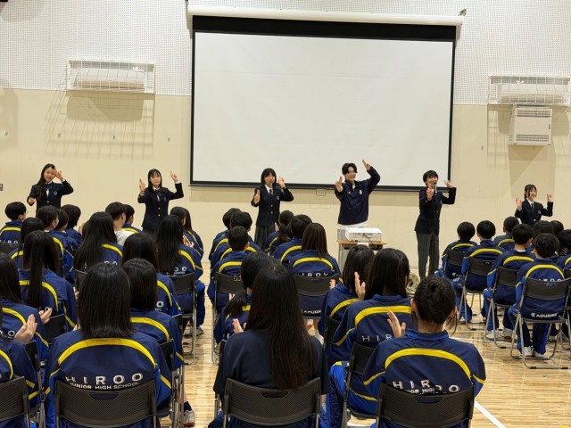 本日の午後に新入生歓迎会を行いました。温かい拍手で1年生が入場した後、最初は生徒会役員によるダンスと説明です!毎年工夫を凝らし、楽しめる内容にしてくれてありがとうございます!
