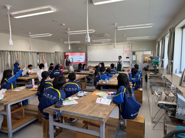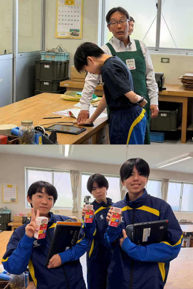 2年生の技術科では未来共創空間(ミラソ)、カゴメ株式会社とのコラボ授業として、トマトの植と食の授業を行います。本日は第1回目の授業として、カゴメの吉田知史様とミラソのスタッフさんにトマトにまつわる授業を行っていただきました。写真は2年1組の様子です。クイズ形式で授業が進み、意外な答えや結果に盛り上がっていました。来週からトマトの定植を行い、夏休み明けには自分たちが育てたトマトでケチャップを作ります。また、カゴメのご厚意により、2年生全員にカゴメトマトジュースをいただきました。ありがとうございました!