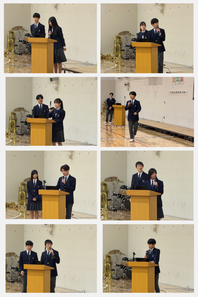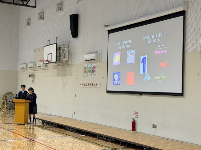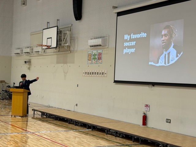 続いて、3年生代表生徒による英語スピーチです。8名の生徒が、映像資料を使いながら見事な英語スピーチを披露しました。今年はステージ上での発表ではないため、スクリーン前に動いて発表する生徒もおり、年々レベルアップしている様子です。