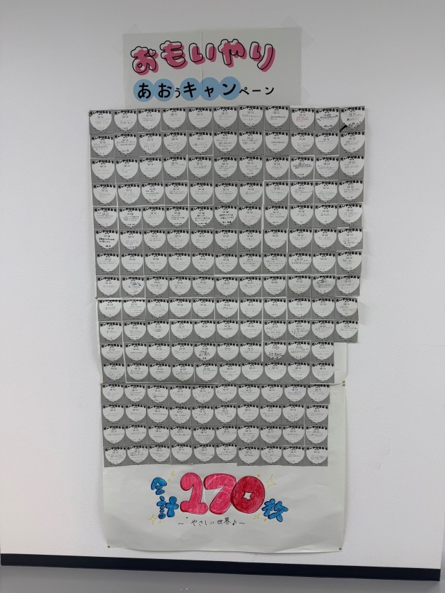 先週で広尾中・松濤中合同企画の思いやりあおうキャンペーンのカード受付が終了しました。金曜日に広尾中と松濤中の生徒会役員が一緒に掲示作業をしました。本日から校長室前でお披露目です。広尾中と松濤中の生徒、先生方も足を止めて見ています。このような合同企画がますます増えることを期待します。なお、同じく合同企画のペットボトルキャンペーンは継続中です。