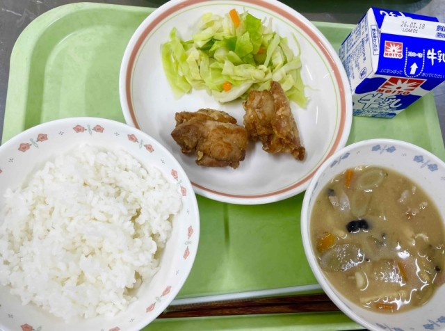 前回行ったリクエスト給食のアンケートでは主菜1位がから揚げでした。から揚げは鶏肉に下味をつけて片栗粉などをまぶして揚げたものです。シンプルでおいしい広尾中で好きな人が一番多いメニューです。残さずおいしくいただきましょう。