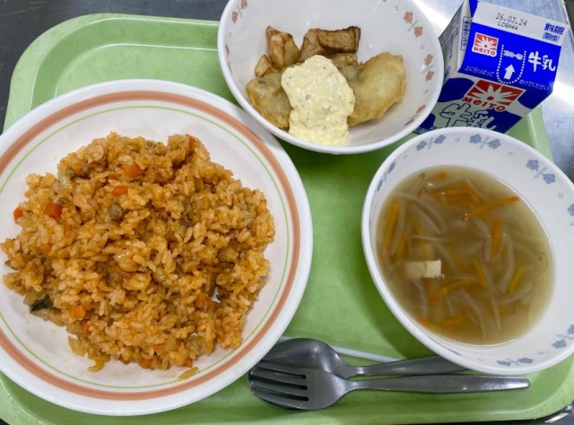 ツナのカレーピラフ 魚のチーズフライ ミネストローネ