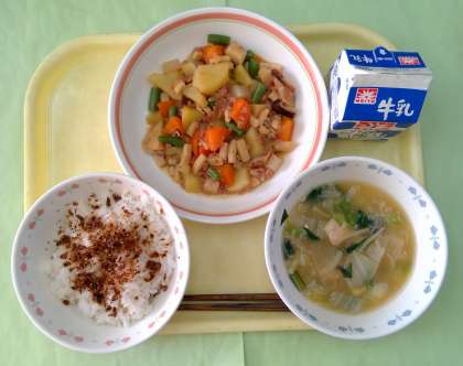 麦ご飯 かつおふりかけ 高野豆腐のそぼろ煮 石狩汁 牛乳