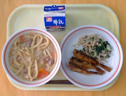 味噌煮込みうどん ハタハタのから揚げ 高野豆腐のごま和え 牛乳