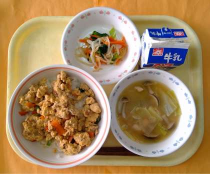 豚玉丼 野菜の辛し醤油和え 石狩汁 牛乳