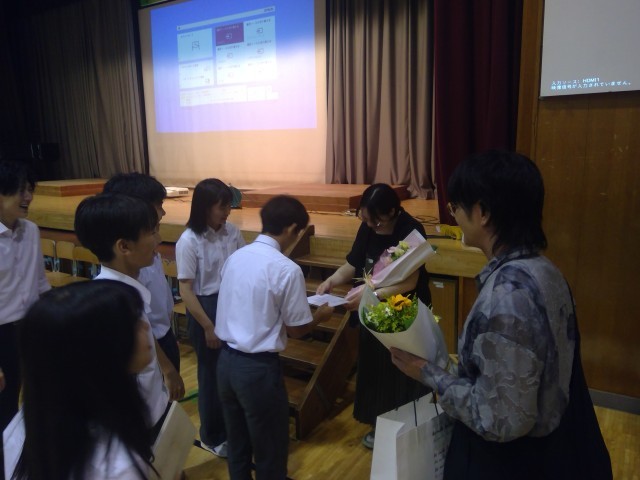 生徒が主体的に企画、発案し大盛況に終わったHIROO祭ですが、生徒会本部役員が昨年中から半年以上かけて準備を進めてくれました。しかも、全員が楽しめるように極力内容が漏れないように気を付けてリハーサルも進めてくれました。生徒会本部役員の皆さん、素敵な会をありがとうございました。生徒会を担当してくれた産休に入った先生、異動された先生も来てくださり、生徒会本部から花束を渡しました。