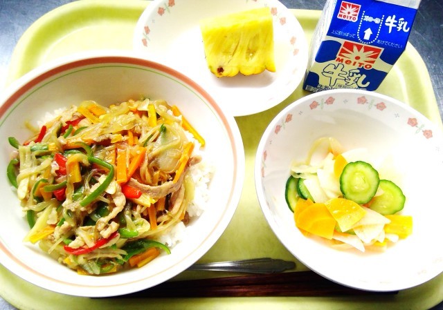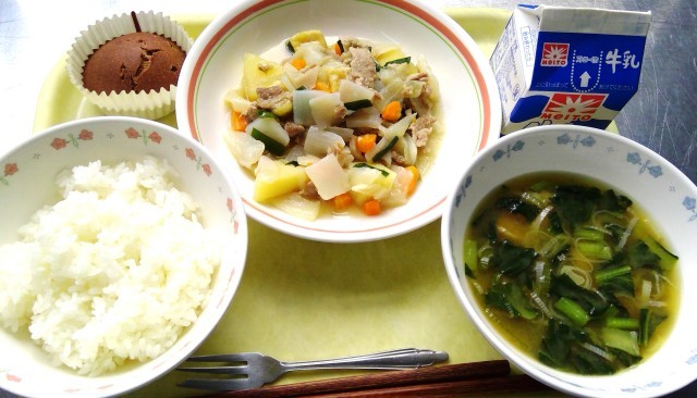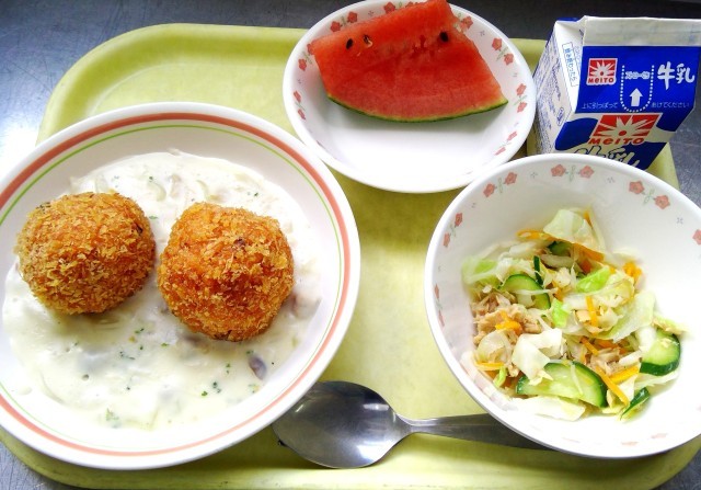 今日は他の学校でも人気の献立です。暑い夏でもにんにくが効いた肉じゃがはおいしく食べられるようです。