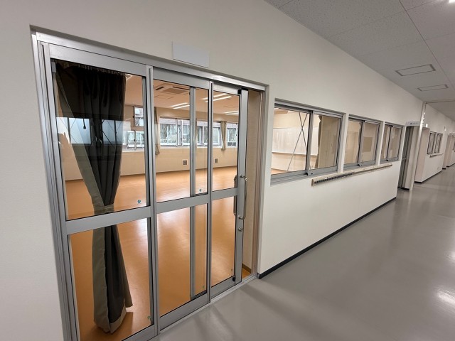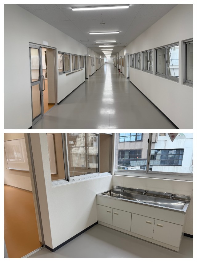 青山キャンパスが完成しました!!完成したての青山キャンパス内部を紹介します。まずは生徒の皆さんが生活する普通教室です。写真は3年1組教室ですが、全教室同じ仕様になっています。黒板ではなくホワイトボードです。写真2枚目は廊下から見た教室になります。前後の出入り口は全面ガラスになっており、授業の様子がよく見えます。写真3枚目は、広尾中の皆さんが生活するA棟の廊下です。手前から3年1組、一番奥が2年1組です。2年1組は写真4枚目のように教室を出てすぐに水道があります。